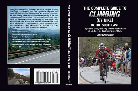 The Complete Guide to Climbing (By Bike) in the Southeast is the ultimate guidebook to climbing by bike and the most difficult hill climbs in the Southeast United States. It includes sections on training for cycling climbing along with memorable climbing performances and other climbing resources.