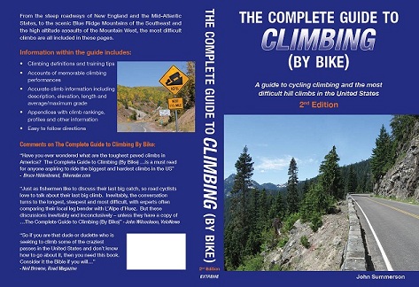 Europe is generally considered to be the epicenter of climbing by bike and that reputation is well-deserved. Full of very steep roads often laid down before regular auto traffic was used on them, Europe does contain many difficult hill climbs along with having the distinction of being home to most of the major cycling tours. Because of this many climbs there are well known; not only to professional riders but also to the legions of amateur cyclists on the continent. As there are few major stage races in the United States, many of the best climbs are relatively unknown. However, the U.S. has a wide variety of climbs comparable to the most difficult used in the major European Tours. Whiteface Mountain in New York for example is almost identical in length and grade (steepness) to the famous French climb of L’Alpe d’Huez, one that is often a stage finish in the Tour de France and considered among the toughest used in that race. Others such as Whitney Portal in California and Mount Equinox in Vermont are even more difficult. Owens Valley in California may have more beyond category (the most difficult classification) climbs within its walls than any location on earth. Nearby Death Valley has multiple category 1 (the second most difficult classification) climbs by itself. There are many climbs with over 5,000 feet of vertical elevation gain, and others that top out in the rarified air above 10,000 feet, including the highest paved road outside of the Andes and Himalayan Mountains. The U.S. also has a select group of climbs that are among the most difficult in the world including Onion Valley Road in California, several Hawaiian giants, unique in that they gain up to and beyond 10,000 vertical feet of continuous climbing, and the incomparable Mount Washington in New Hampshire, which may be the toughest of them all...